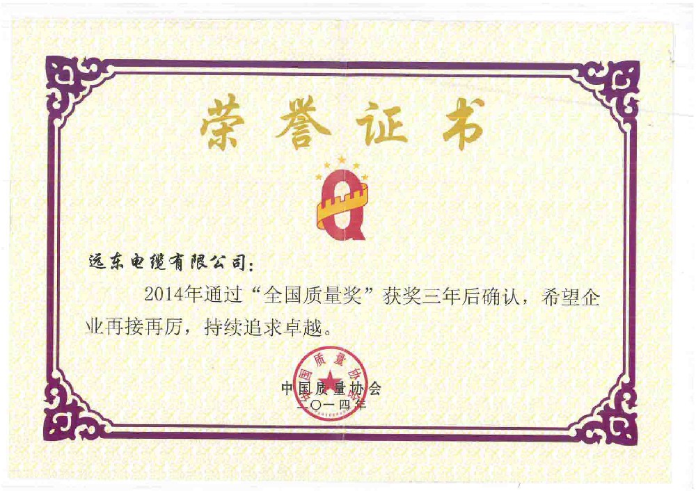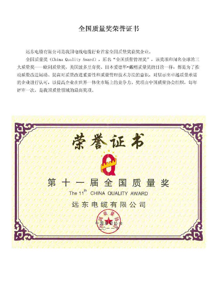 全国质量奖荣誉证书