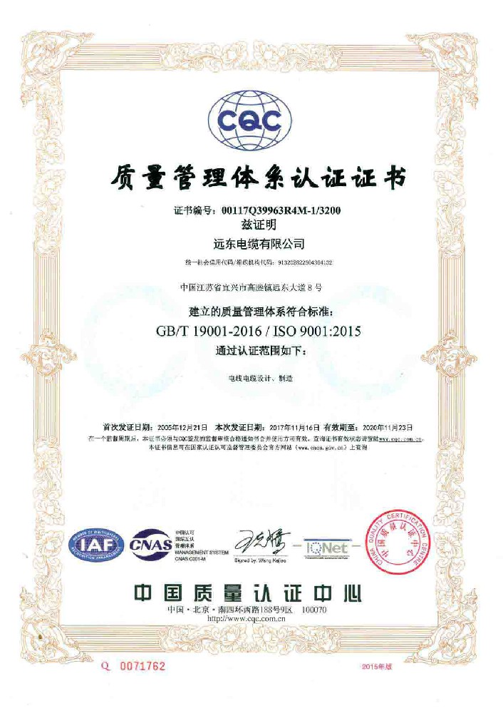 质量管理体系认证证书